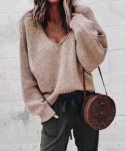 Women’s Fashion Autumn Deep V-neck Solid Color Sweater