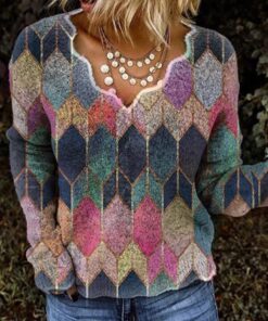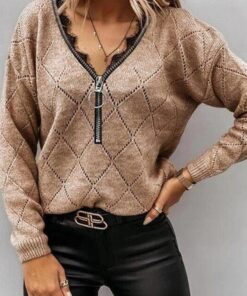 Women Zipper V neck Geometric Knit Shirts&Tops