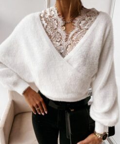 Women Flannel Double V neck Plain Lace Decor Sweater
