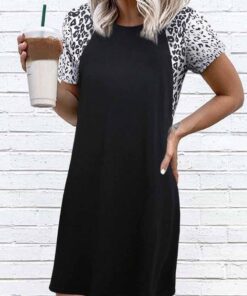 ⭐Round Neck Rotator Sleeve Leopard Print Stitching Mini Dress