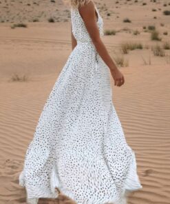 V Neck Dot Printed Floor Length Dress(3 Colors)