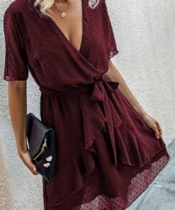 Swiss Dot V-Neck Dress With Belt(3 Colors)