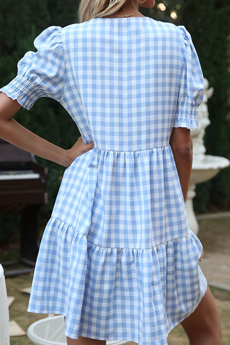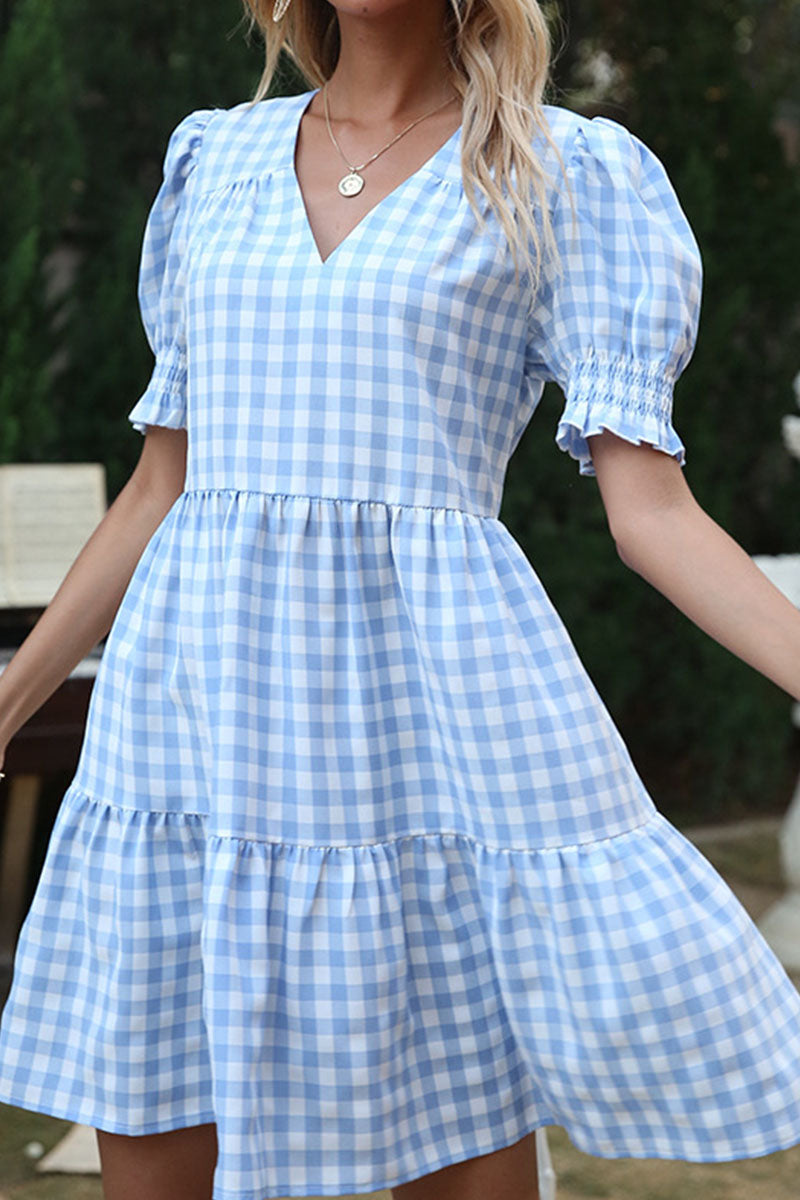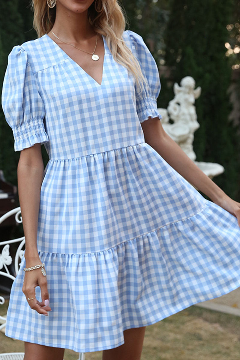 ?Fashion Sweet Plaid Split Joint V Neck A Line Dresses