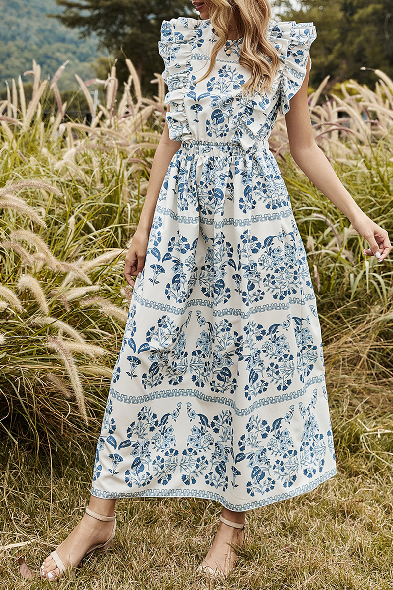 ?Fashion Elegant Floral Backless Flounce O Neck A Line Dresses