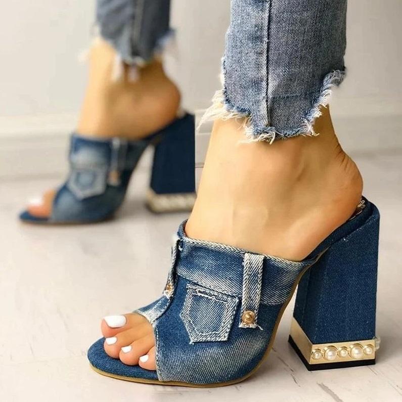 Be the first to review “Colawings Denim Distressed Peep Open Toe Chunky Heels Slides”