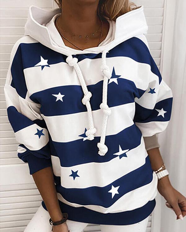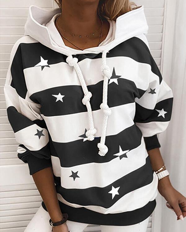 Hat collar Long Sleeve Stripe Star Print Casual Hoodie