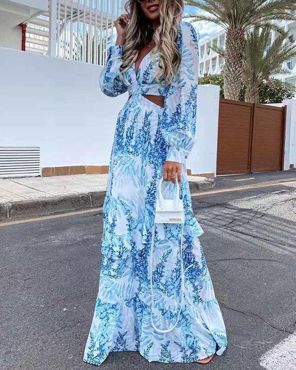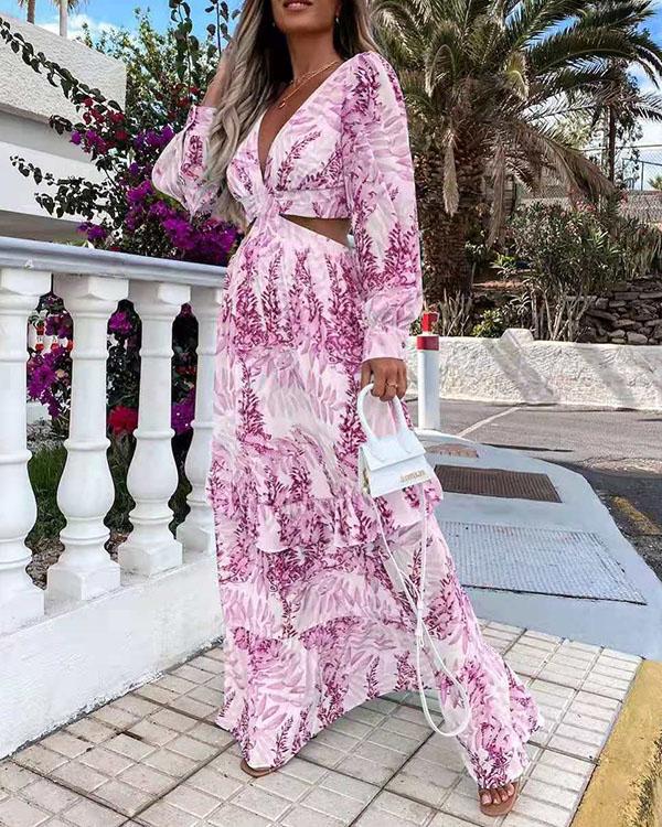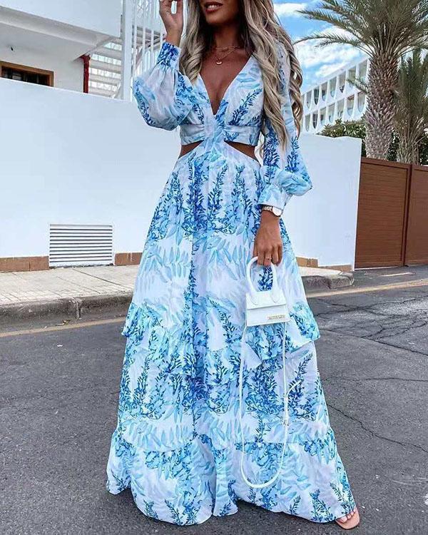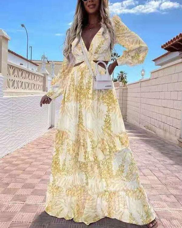 Long Sleeve Print V-Neck Floor-Length Expansion Women’s Dress