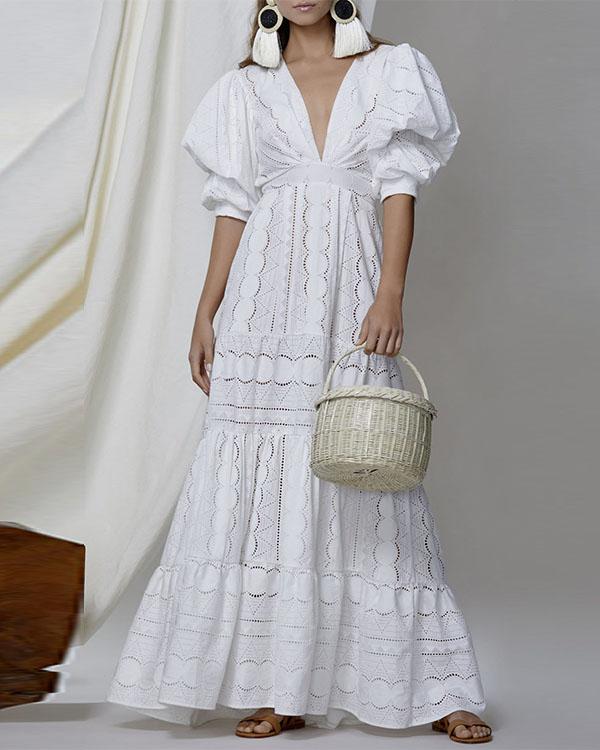 Personalized V Neck Highwaist Hollow Ruffle Puff Sleeve Maxi Dress