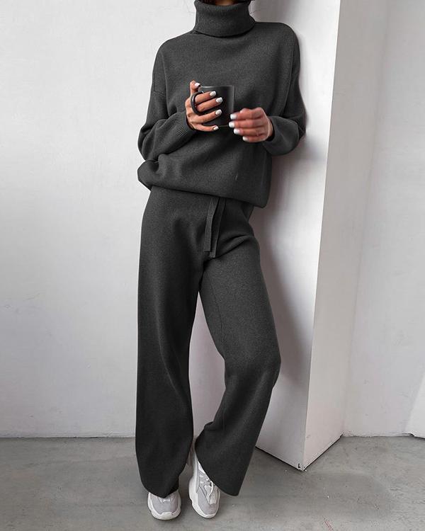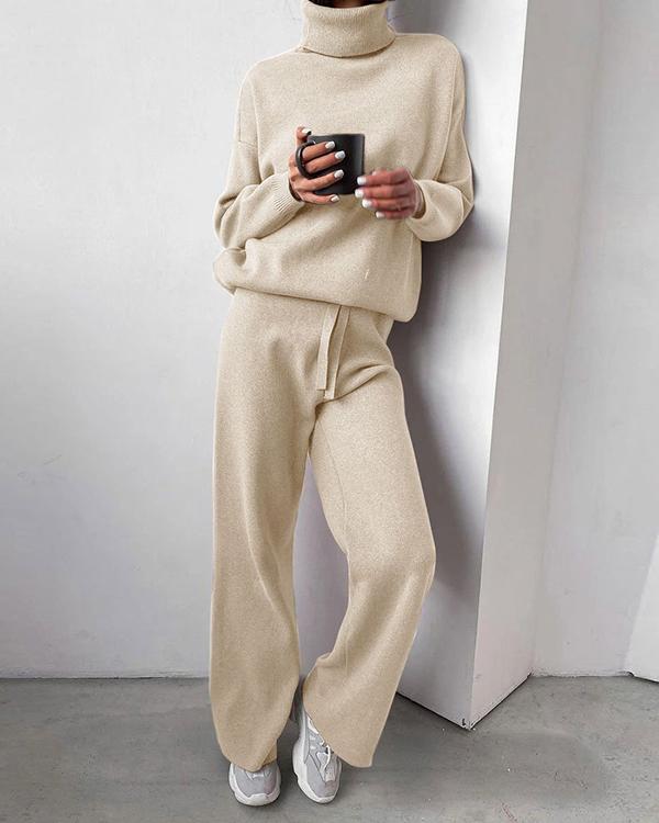Pure color casual high-necked long-sleeved sweater and trousers women’s suit