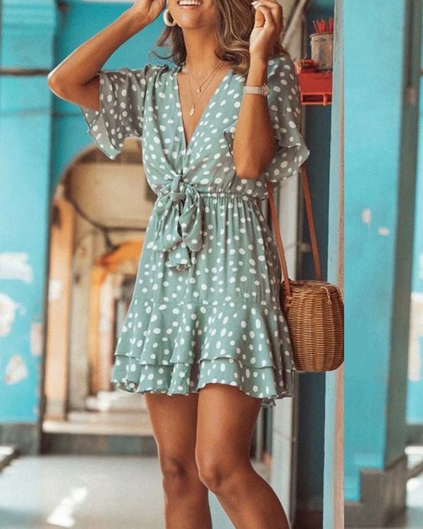 Ruffled Short Sleeve V-neck Polka Dot Lace Up Mini Dress