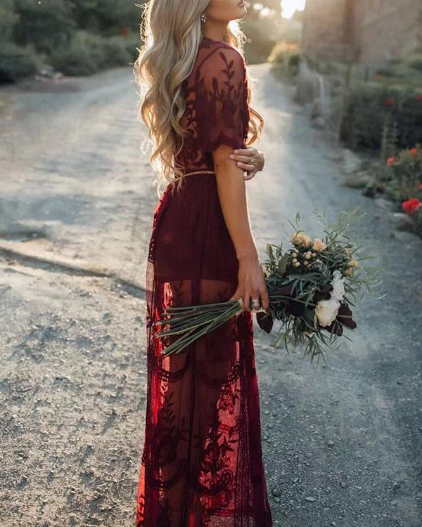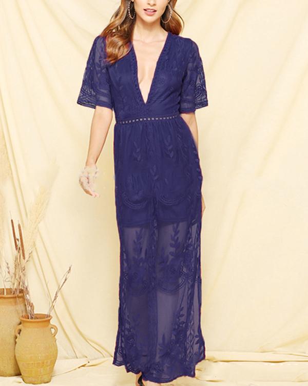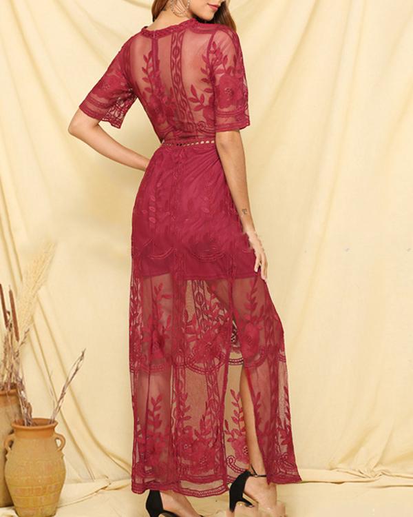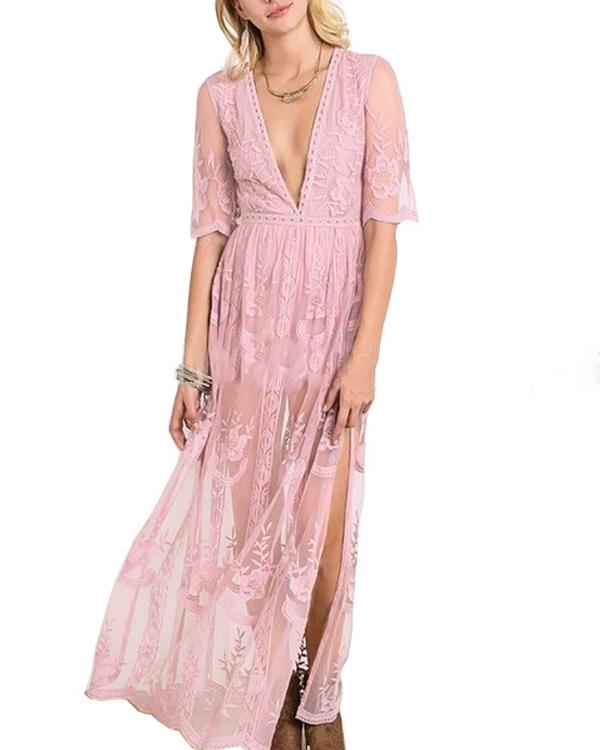 Sexy V Neck Floral Hollow Transparent Holiday Maxi Dress*