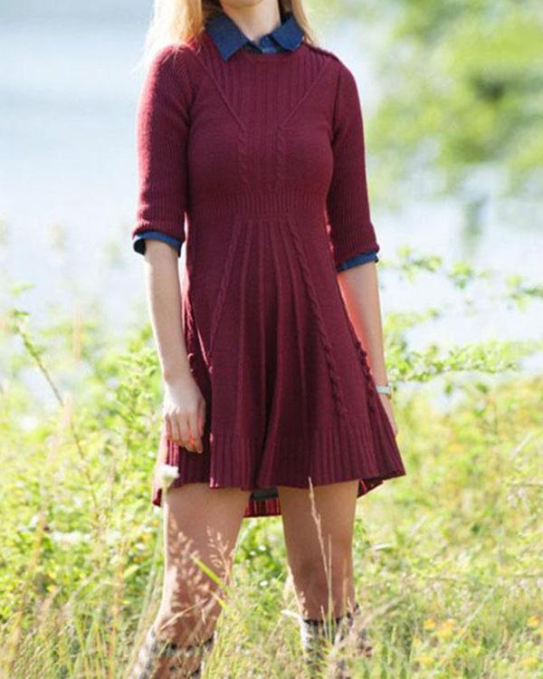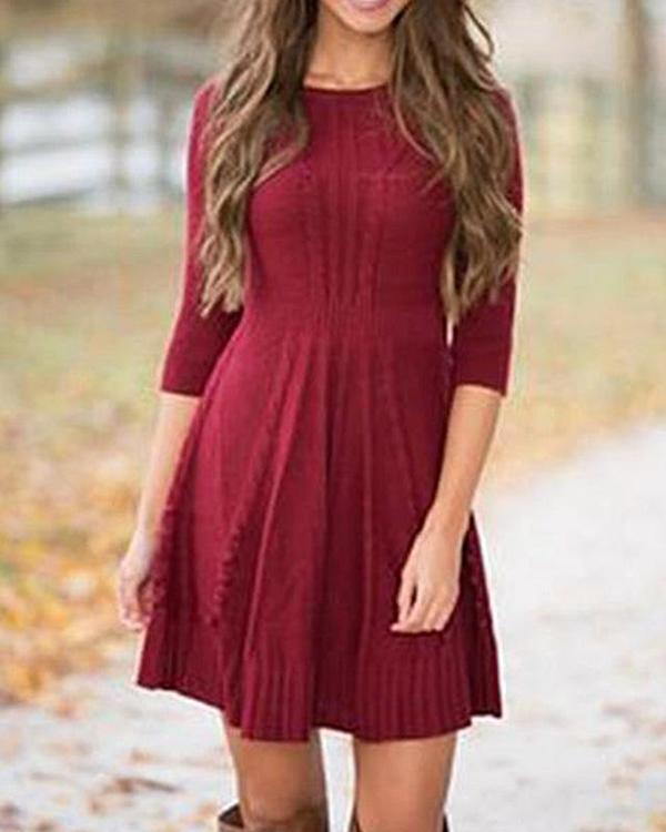 Solid Long Sleeves A-line Above Knee Crew Neck Dress
