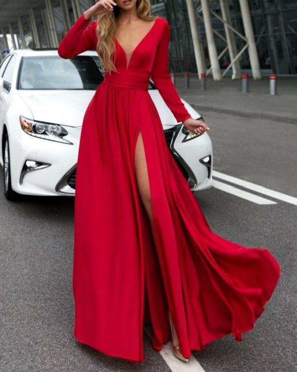 V-Neck Solid Color Long Sleevethe Sides Split Maxi Dress*