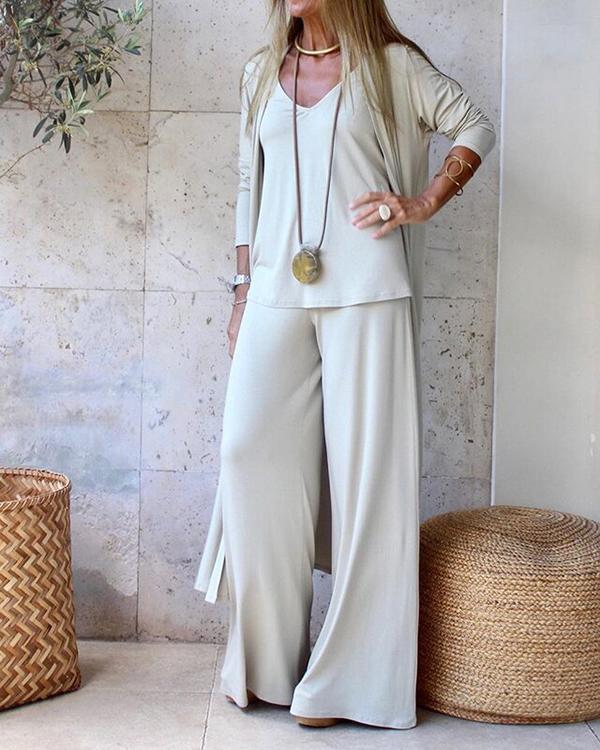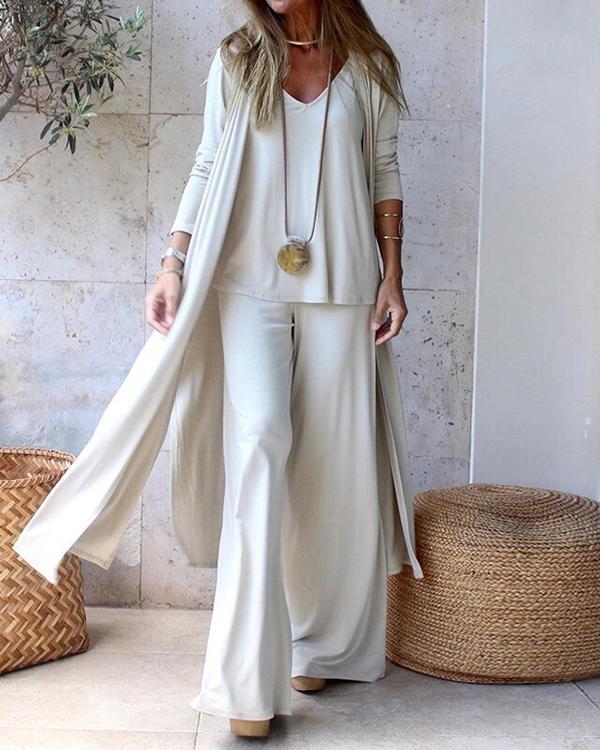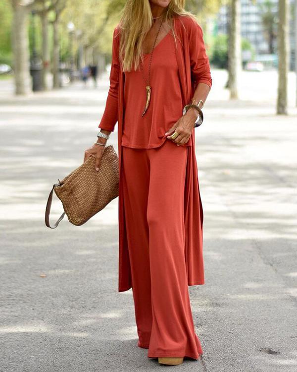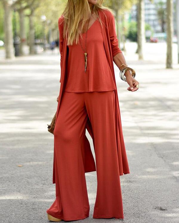 Women Autumn Casual 3-Piece Set Solid Long Cardigan Camis&Pants Suit