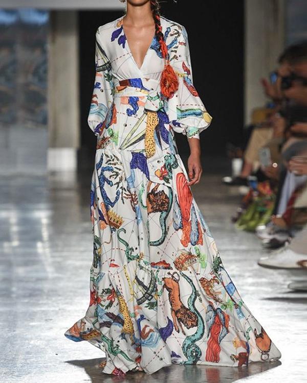 Women Autumn Print A-line Dress V Neck Floor Length High-waist Dress