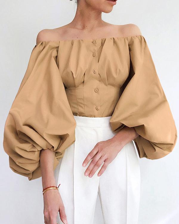 Women Cotton Lantern Sleeve Off Shoulder Button up Blouses