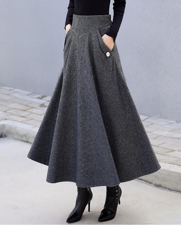 Women Woolen Elegant High Waist Plaid Skirts