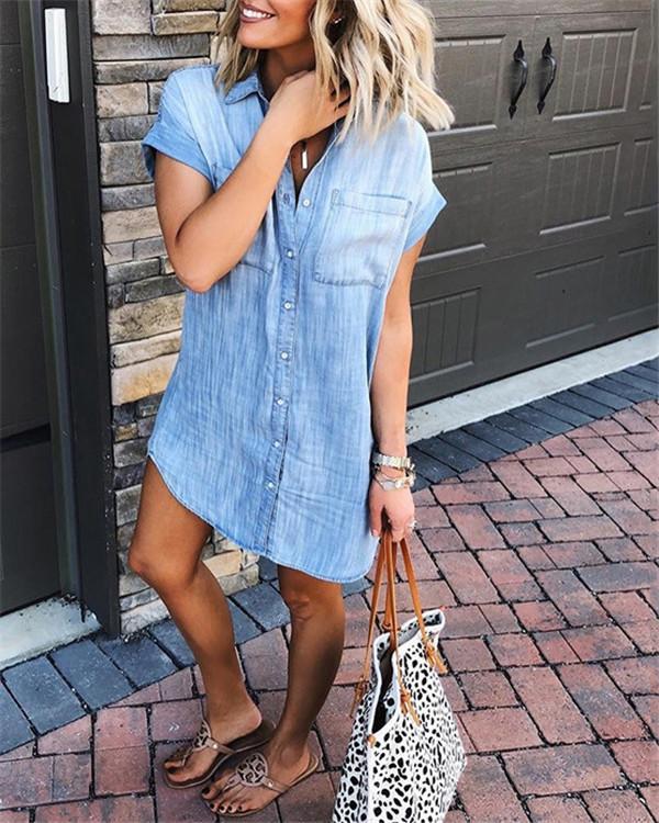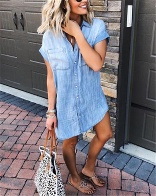 Women’s Loose Denim Blouse Mini Dress Button Down Lapel Short Sleeve T-Shirt Tops with Pockets