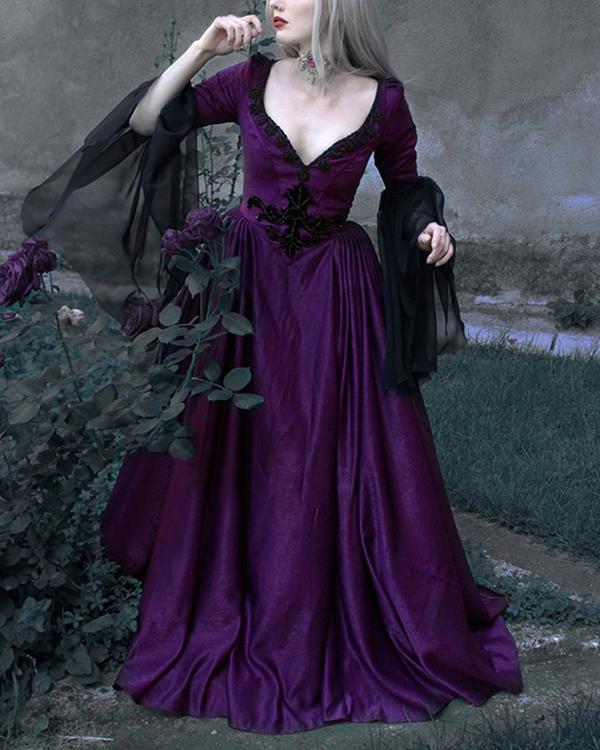 Women’S Retro Slim Solid Lace And Low V-Neck Dress